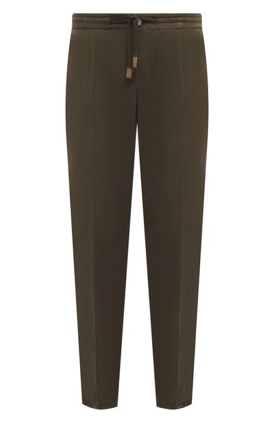 Брюки цвета хаки подружатся с самой разной одеждой и обувью. Зауженную модель с четырьмя карманами выполнили из тонкой дышащей хлопковой ткани, в которую добавили гладкий, немного блестящий шелк и эластан. Привычные шлевки на поясе заменили кулиской и шнуром, позволяющим носить изделие без ремня.