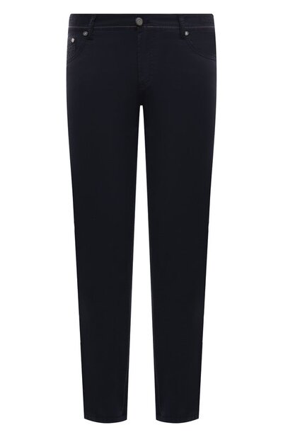 Темно-синие зауженные брюки из линии Tokyo дополнили пятью карманами, сделав похожими на джинсы. Для пошива модели с заниженной посадкой использовали легкий эластичный габардин. Изделие из такого дышащего материала почти не ощущается на теле и сохраняет полную свободу движений. На поясе сзади — брендированный патч, который рифмуется с вышитой эмблемой на монетном кармане.