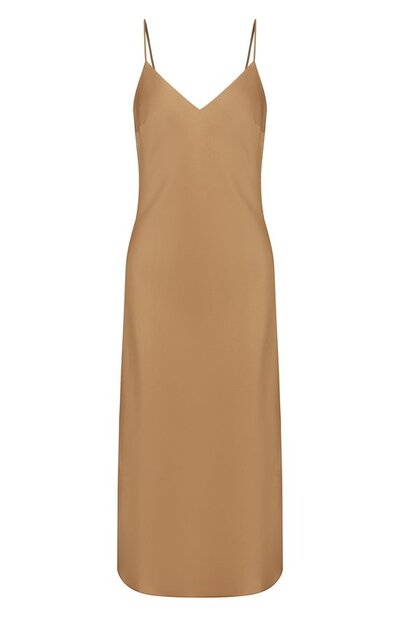 Платье-комбинацию с узкими бретелями и глубокими V-образными вырезами спереди и сзади выполнили из вискозного атласа. Полуприталенную модель наши стилисты предлагают носить с босоножками в тон.