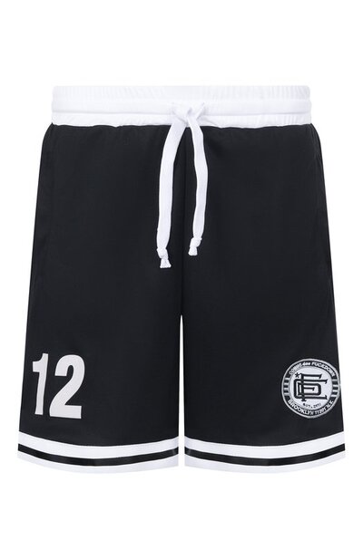Для пошива широких шортов с эластичным поясом-кулиской и двумя боковыми карманами использовали гладкий полиэстер. Изделие украсили контрастными полосами по низу, брендированным патчем спереди и принтом с числом 12.