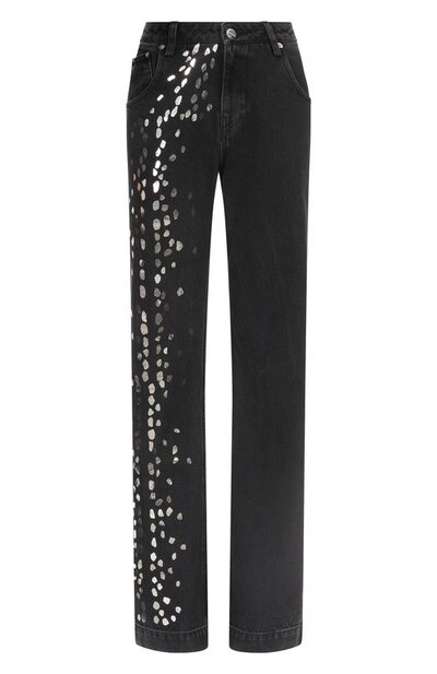 Джинсы со средней посадкой и пятью карманами сшиты из хлопкового денима. Модель прямого кроя украшена перламутровыми блестками спереди и металлической эмблемой сзади.