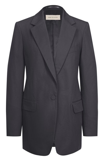 Жакет с шелковистым подкладом в тон выполнили из хлопка. Модель со шлицей и тремя карманами предлагаем сочетать с парными брюками и принтованным пуловером.