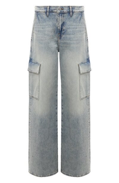 Голубые джинсы с крупными боковыми карманами, как у карго, выполнили из слегка эластичного хлопка средней плотности. Декоративные заломы и потертости придают изделию с чуть заниженной посадкой состаренный вид. Такая модель станет удачным компаньоном и для кремового свитера, и для яркого топа.
