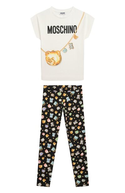 В белой футболке с принтом в виде фирменной кросс-боди и черных легинсах с паттерном из разноцветных кристальных подвесок-медвежат будет комфортно во время спокойной прогулки и подвижных игр. Для пошива комплекта использовали мягкое хлопковое джерси, которое хорошо пропускает воздух и поддерживает оптимальный микроклимат. За счет эластана в составе изделия надолго сохранят исходный вид.