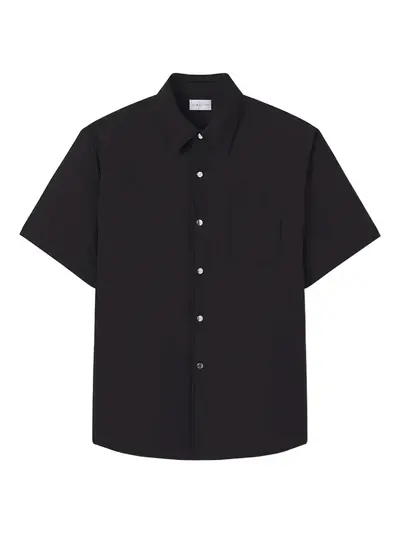 black front press-stud fastening classic collar short sleeves chest patch pocket curved hem