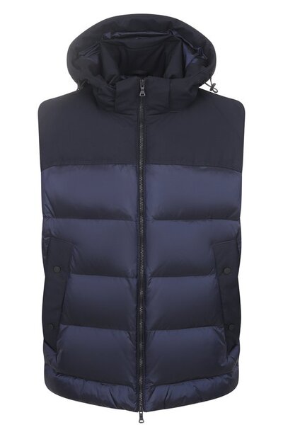 Стеганый жилет Hybrid со съемным капюшоном и кулиской внизу сшит из комбинации матового и глянцевого нейлона. Модель с утеплителем Re-Goose Down дополнена двумя внешними карманами на кнопках и внутренним с защитой от электромагнитного излучения.