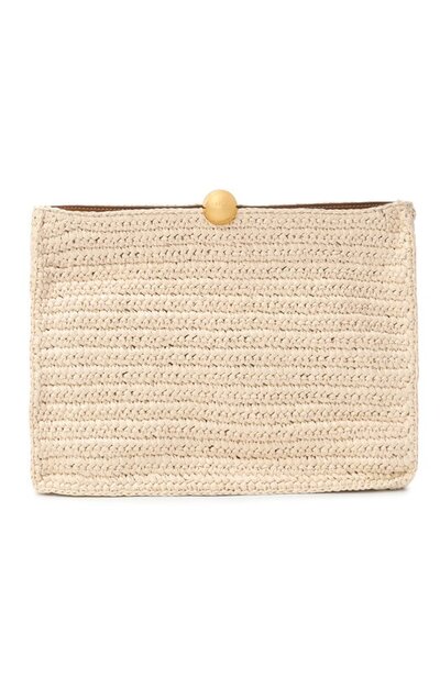 Клатч Sfera Soft с отделкой из гладкой кожи связали в технике кроше из полипропиленовой пряжи, напоминающей рафию. Аксессуар на молнии дополнили магнитным золотистым замком-сферой с выгравированным логотипом.