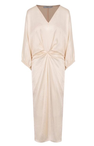 Миди-платье с глубоким V-образным вырезом спереди и напуском на спинке сшили из фактурного полисилка. Модель со сборкой на талии дополнили рукавами 3/4 с эластичными манжетами.