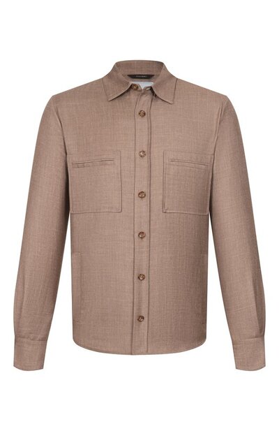 Рубашку прямого кроя сшили из легкой кашемировой фланели с добавлением шелка и льна. Модель с закругленным подолом и двумя нагрудными карманами застегивается роговыми пуговицами.