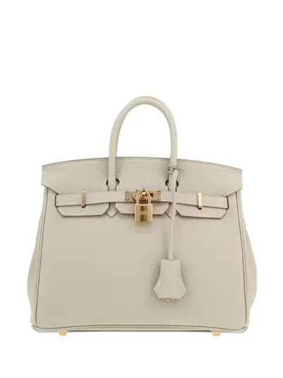 light grey Togo leather two rolled top handles foldover top signature sangles straps twist-lock fastening padlock fastening main compartment internal zip-fastening pocket internal slip pocket internal logo stamp metal feet hanging key fob set of keys gold-tone hardware This piece comes complete with a protective dust bag. Condition: EXCELLENT. This previously owned item is in near-perfect condition with no signs of damage or use.