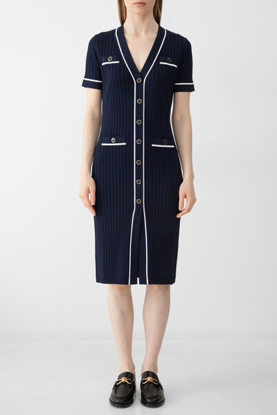 Трикотажное платье Candelotto прилегающего силуэта от Luisa Spagnoli. Для изготовления модели-миди с фактурным полосатым мотивом выбраны прочный нейлон и вискозное волокно тёмно-синего цвета. Благодаря застёжке на круглые пуговицы изделие по внешнему виду напоминает кардиган. Декором выступают белые полосы-окантовка на глубоком V-образным вырезе горловины, по обе стороны планки застёжки, в отделке карманов и на манжетах рукавов.