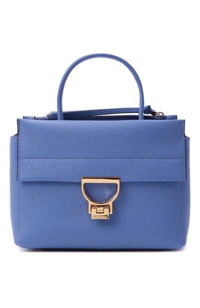 Для пошива сумки Arlettis на магнитной кнопке использовали зернистую кожу оттенка Azul. У аксессуара предусмотрели один внутренний карман и два наружных: с молнией на задней панели и с клапаном, закрывающимся фирменным замком, на передней. В комплекте – съемный регулируемый ремень.