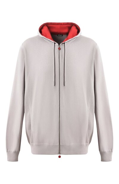 Толстовку с манжетами и поясом в рубчик дополнили регулируемым капюшоном и боковыми карманами. Модель из хлопкового трикотажа застегивается встречной молнией с пуллерами фирменного алого оттенка.