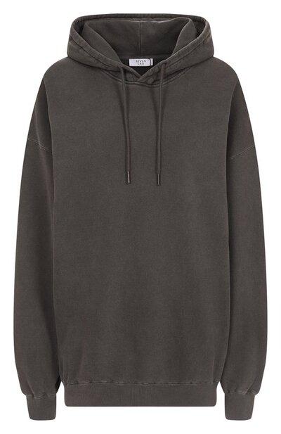 Визуально состаренное худи с регулируемым капюшоном сшили из хлопкового футера. Изделие с манжетами и поясом в рубчик украсили сзади кристальной надписью «It's not me, it's just mercury retrograde».
