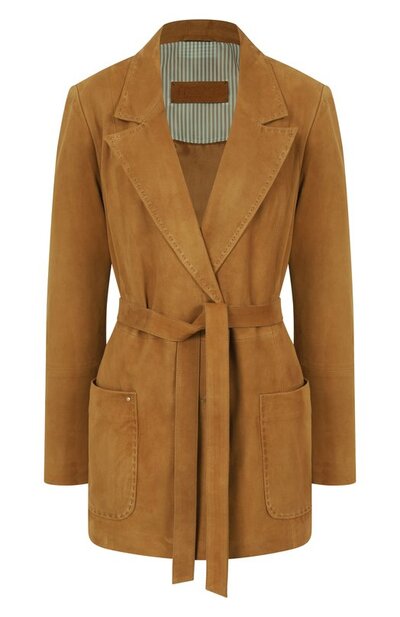 Для изготовления куртки, прошитой по краям крупной строчкой пунто, использовали тонкую замшу из кожи ягненка. Модель с накладными боковыми карманами дополнили поясом-лентой.