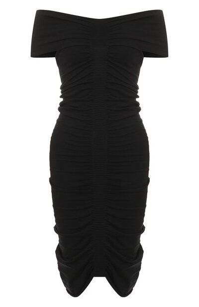 Мини-платье с открытой линией плеч выполнили из эластичного трикотажа на основе купро, полиэстера и нейлона. Спереди и на спинке модели сформировали вертикальные полосы, от которых расходятся мелкие складки.