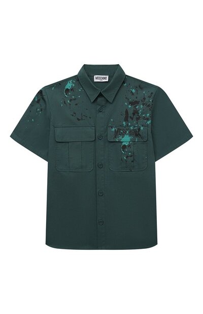 Темно-зеленая рубашка выполнена из дышащего хлопка, который поддерживает комфортный микроклимат даже во время активных игр и летней жары. Модель декорирована принтом, напоминающим брызги краски. Два накладных кармана с едва заметным логотипом закрываются на клапаны.