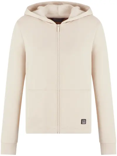 light beige front zip fastening two front pouch pockets classic hood ribbed cuffs and hem