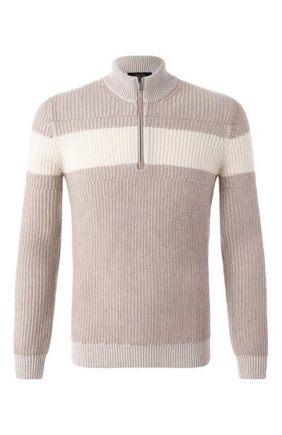Свитер с широкой полосой спереди станет основой комфортного непринужденного образа. Модель с эластичными манжетами и поясом связали фактурным узором из кашемира и шерсти. Молнию на воротнике изделия скрыли под планками из замши, выполнив из такого же материала брендированную нашивку сзади.
