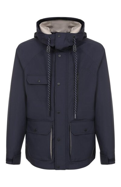 Для пошива куртки с регулируемым капюшоном использовали влаго- и ветронепроницаемую мембранную ткань Pertex® Shield Revolve™ из переработанного полиэстера. Модель с застежкой под штормовой планкой дополнили тремя накладными карманами с клапанами на кнопках и одним с молнией.