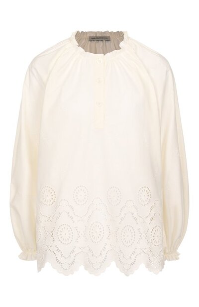 Свободную блузу с объемными рукавами реглан, складками вдоль эластичной круглой горловины и планкой с пуговицами спереди выполнили из тонкой хлопковой ткани. Модель с фигурным низом и манжетами-оборками декорировали ажурной вышивкой в этническом стиле.