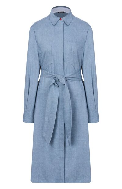Платье-рубашку из эластичной льняной ткани украсили вышитыми литерами К на вставках по бокам фигурного подола. Модель с прямоугольными манжетами и супатной застежкой дополнили четырьмя карманами, включая пару нагрудных. В комплекте — пояс-лента.