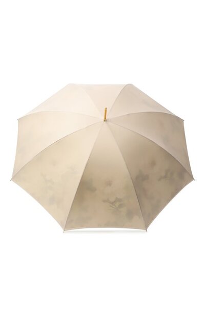 Зонт-трость выполнили из двух видов полиэстера ─ однотонного и с цветочным принтом. Изогнутую ручку аксессуара обшили гладкой кожей. В комплект входит золотистое брендированное кольцо-фиксатор.