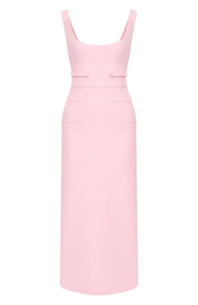 Платье-футляр с квадратным вырезом, без рукавов выполнили из фактурной вискозной ткани. Модель с потайной молнией на спинке и разрезом на прямом подоле сзади дополнили спереди парой накладных карманов и двумя клапанами, имитирующими врезные.