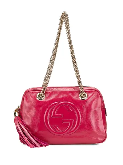 patent leather body chain link straps top zip closure interior zip and slip pockets pink Serial Number: 308983 520981 This item has no inclusions. Condition: EXCELLENT. This previously owned item is in near-perfect condition with no signs of damage or use. Please refer to the photos on this product page for a detailed view of the item, including any damages declared.