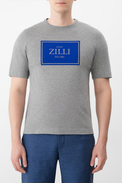 Меланжевая футболка с круглым вырезом горловины на резинке от Zilli. Для производства изделия прямого силуэта используется серый хлопковый трикотаж. Декором выступает синяя прямоугольная вставка-принт с логотипом Дома и годом его основания.