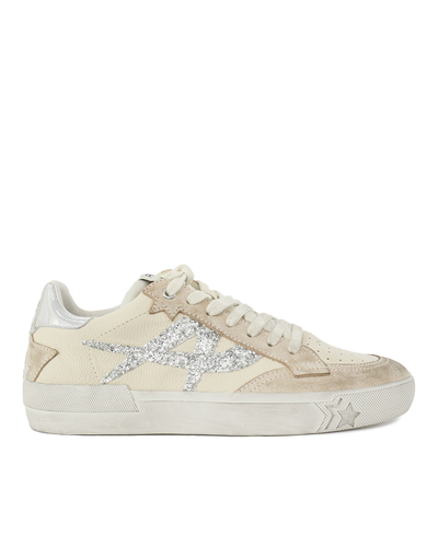 Пара кед MOONLIGHT в винтажном стиле добавит нотку гранжа вашим повседневным аутфитам. Верх из натуральной кожи молочного цвета с нарочитыми потертостями дополнен контрастным серебряным задником и блестящей буквой «А» на боковой части. Завершает силуэт плоская шнуровка белого цвета и подошва со звездами и декоративными затемнениями.