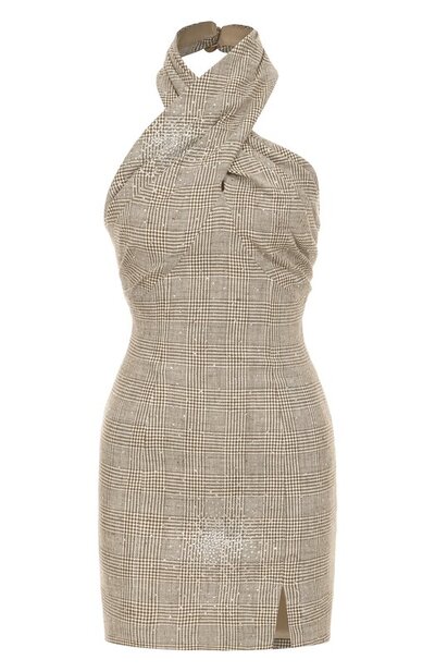 Приталенное мини-платье с широкой монобретелью, драпировкой на лифе и открытой спиной сшили из клетчатой ткани на основе вискозы, хлопка и льна. Модель, украшенная миниатюрными стразами по всей поверхности, застегивается молнией сзади.