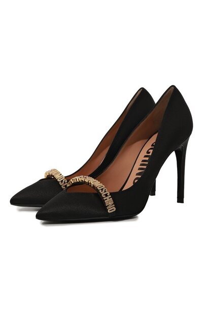 Классическим туфлям-лодочкам универсального черного цвета добавили яркий акцент. Глубокий фигурный вырез дополнили перемычкой, украшенной золотистым паттерном из логотипа марки, основанной Франко Москино. Каждую букву инкрустировали кристаллами, сияющими в лучах света. Модель на высокой шпильке сшили из мягкого фактурного атласа.