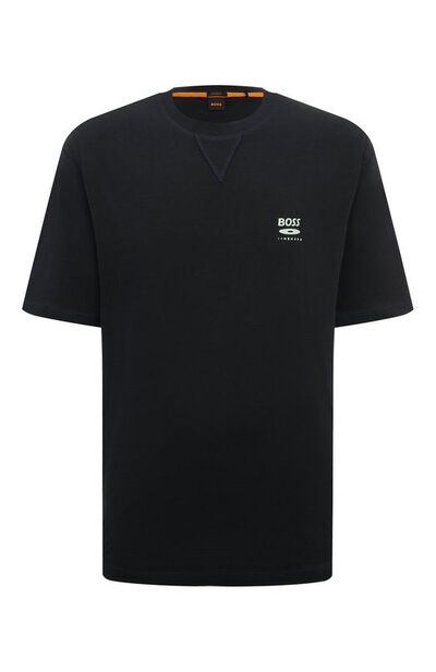 Для пошива темно-синей футболки с круглым вырезом и слегка спущенной линией плеч использовали гладкое джерси из органического хлопка. Спереди модель украсили небольшим брендированным принтом, который сзади поддерживает крупный мотив в виде диджейского пульта, сопровожденный надписью BOSS Y2K.