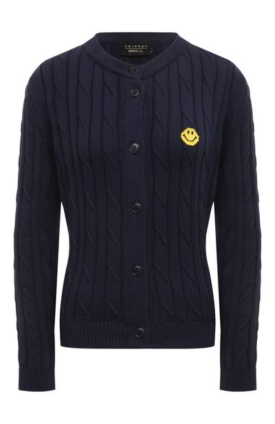 Синий кардиган с фактурным арановым узором декорировали желтым миниатюрным патчем в виде вышитого смайла. За комфорт в течение дня отвечает мягкая хлопковая пряжа, которая не вытягивается и не пилингуется со временем. Изделие с круглой горловиной предлагаем сочетать с джинсами и лоферами в схожей палитре.