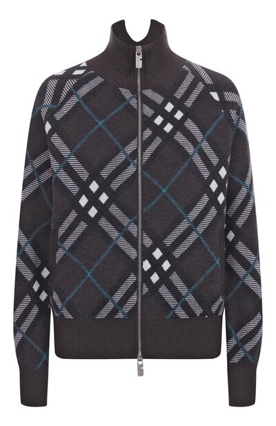 Кардиган в клетку Burberry Check связали из чуть эластичной шерстяной пряжи с добавлением мохера и полиамида. Высокую однотонную горловину модели дополнили разрезом сзади, поэтому ее можно опустить, превратив в отложной воротник. Изделие с боковыми карманами застегивается встречной молнией с пуллерами в виде литеры B.