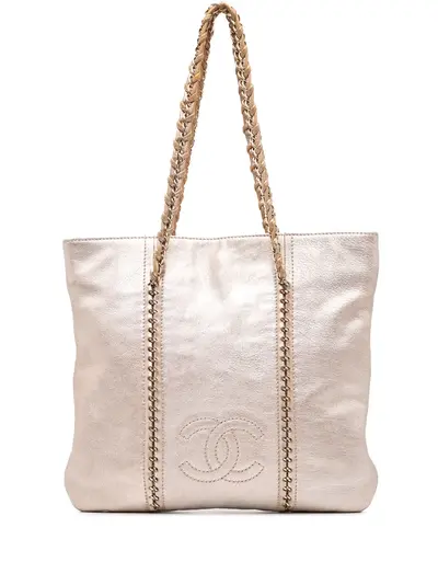 leather body leather and leather woven chain link straps open top with snap closure interior zip and slip pockets gold Serial Number: 10611705 This item has no inclusions. Condition: GOOD. This previously owned and used item is in good condition with minimal signs of use. This may include fading of material or plating and scratches. Please refer to the photos on this product page for a detailed view of the item, including any damages declared.