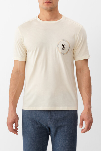 Футболка с крупной символикой бренда Stefano Ricci. Изделие выполнено из мягкого трикотажа на основе хлопка и модала ванильного оттенка. О принадлежности модели прямого силуэта Дому напоминает круглая дизайнерская вышивка в виде ремешков со вписанным в неё металлическим лого-монограммой.