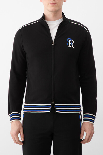 Толстовка из эластичного хлопкового трикотажа чёрного цвета от Stefano Ricci. Конструкция изделия прямого силуэта предполагает наличие воротника-стойки и застёжки на встречную молнию с двумя брендированными пуллерами. Отличительными делателями являются трёхцветный полосатый принт на внутренней стороне воротника, манжетах рукавов и широком поясе и крупная вышитая аббревиатура SR слева на груди. Дополните образ спортивными брюками на кулиске из той же коллекции.