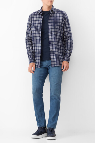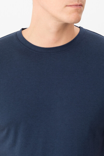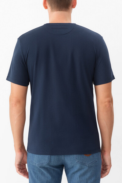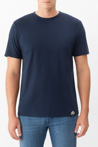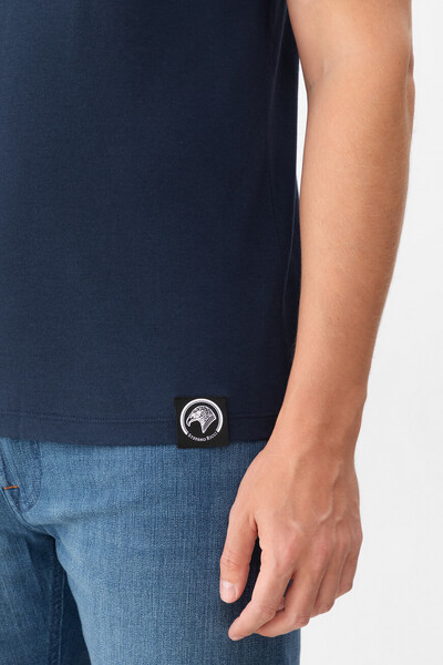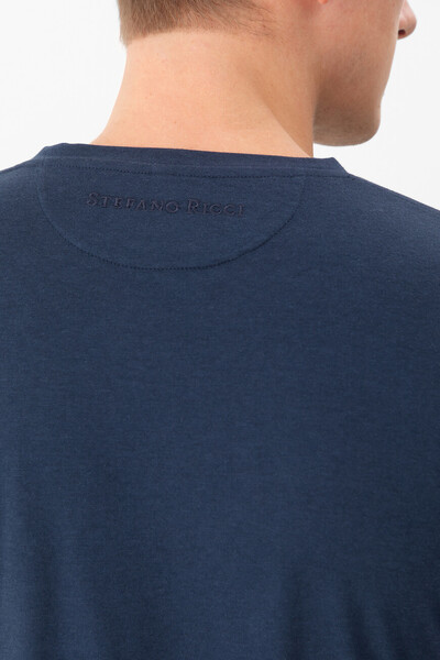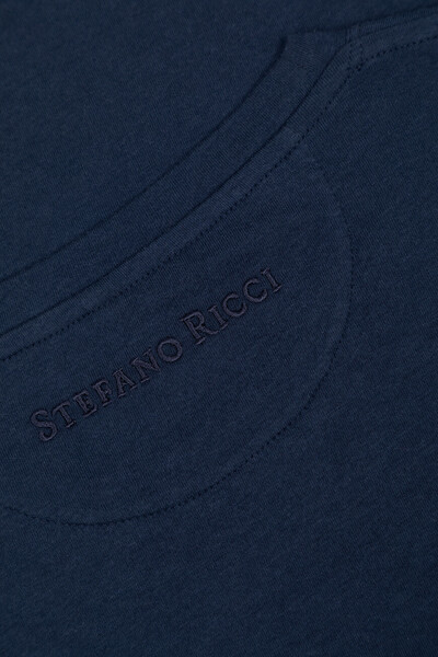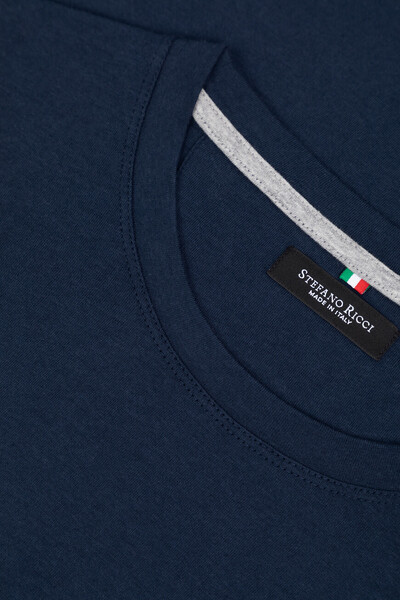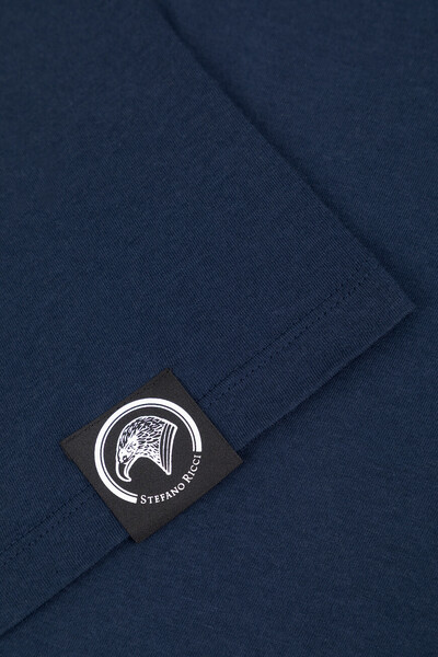 Трикотажная футболка Stefano Ricci с неброской символикой Дома. Изделие прилегающего силуэта выполнено на основе хлопка и модала в глубоком синем оттенке и дополнено круглым вырезом горловины на резинке. Спереди сбоку размещена чёрная вставка с контрастными логотипом и изображением головы орла.