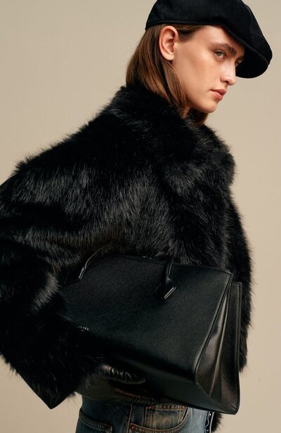 Сумку Le Teckel с перемычкой на удлиненных трубчатых ручках выполнили из зернистой телячьей кожи. Модель с фольгированным логотипом спереди закрывается потайными магнитами. Внутри – два отделения, в одном из которых карман со встречной молнией.