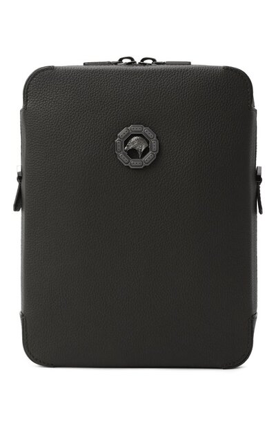 Сумку со съемным плечевым ремнем сшили из зернистой телячьей кожи. Аксессуар, застегивающийся встречной молнией, украсили октагоном с головой орла, выполненным из металла с рутениевым финишем.