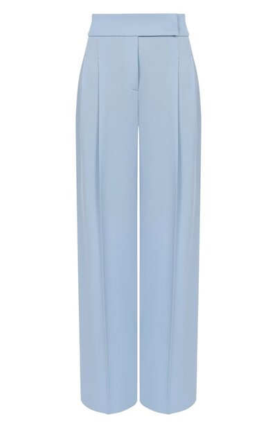 Для пошива брюк-палаццо с высокой посадкой и эластичным широким поясом использовали габардин из шерсти первого пострига. Изделие со стрелками и защипами дополнили четырьмя врезными карманами.