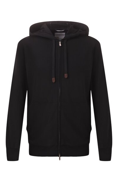 Толстовку с двумя накладными карманами сшили из шерстяного трикотажа. Объемный капюшон дополнили шнуром с замшевыми наконечниками. Модель застегивается встречной молнией с брендированными пуллерами.