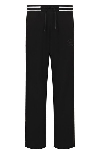 Брюки с контрастными полосами на рифленом поясе-кулиске сшили из полиэстерового трикотажа с добавлением модала и хлопка. Модель с тремя карманами и кнопками на боковых разрезах украсили вышитой нитью в тон брендированной эмблемой.