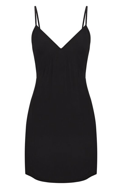 Короткое платье-комбинацию Rameli с завышенной талией и глубоким V-образным вырезом выполнили из тонкой вискозы. Модель с узкими бретелями, покрытыми гранеными стразами, декорировали сзади ажурной вышивкой в виде фирменных крыльев.