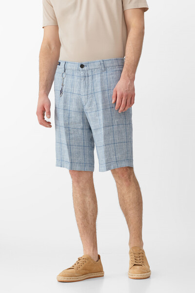 Короткие бермуды Paul&Shark выполнены в белом и голубых тонах. Модель изготовлена из лёгкого льна, который обеспечивает воздухопроницаемость и комфорт в тёплые дни, и покрыта геометрическим мотивом в крупную клетку. О принадлежности изделия Дому напоминает миниатюрная вышивка в виде силуэта акулы над правым задним карманом. В комплекте также - крупный фирменный брелок с акулой.