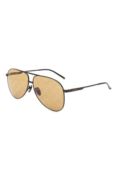 Авиаторы с двойным мостом изготовили из тонкого металла. Узкие дужки украсили накладкой в цветах ленты Web, а линзы, блокирующие ультрафиолет, — архивным узором из монограмм GG.