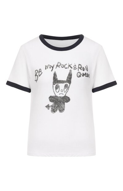 Футболку Woos изготовили из трикотажа, сочетающего хлопок, лен и переработанный полиэстер. Модель с контрастной отделкой на манжетах и круглой горловине украсили мотивом Devil Queen, подчеркнутым стразами.