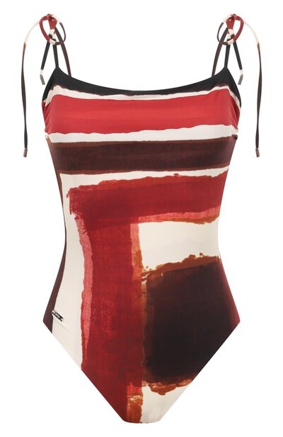 Слитный купальник из полиамида стрейч украсили неровным абстрактным узором, будто нарисованным кистью и красками. Модель с бретелями-завязками дополнили небольшой брендированной пластиной снизу.